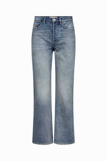 High waist jeans with a slim fit through the hip and a straight taperedleg. Cut from mid-blue rigid denim with worn-in fading and light whiskering. The silhouette is clean and minimal, offering a flattering everyday shape with vintage attitude.