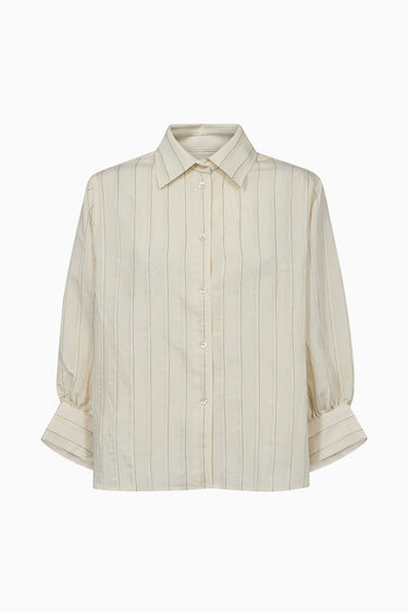The Missoula Hepburn Shirt in Ecru combines modern elegance with subtle detailing. Crafted from a lightweight fabric, this shirt features delicate black stitching in a striped pattern, creating a refined and understated look. The rounded collar adds a soft, classic touch, while the voluminous sleeves with high cuffs enhance its sophisticated silhouette. The Missoula Hepburn Shirt is designed to elevate any wardrobe with its versatile, timeless style.